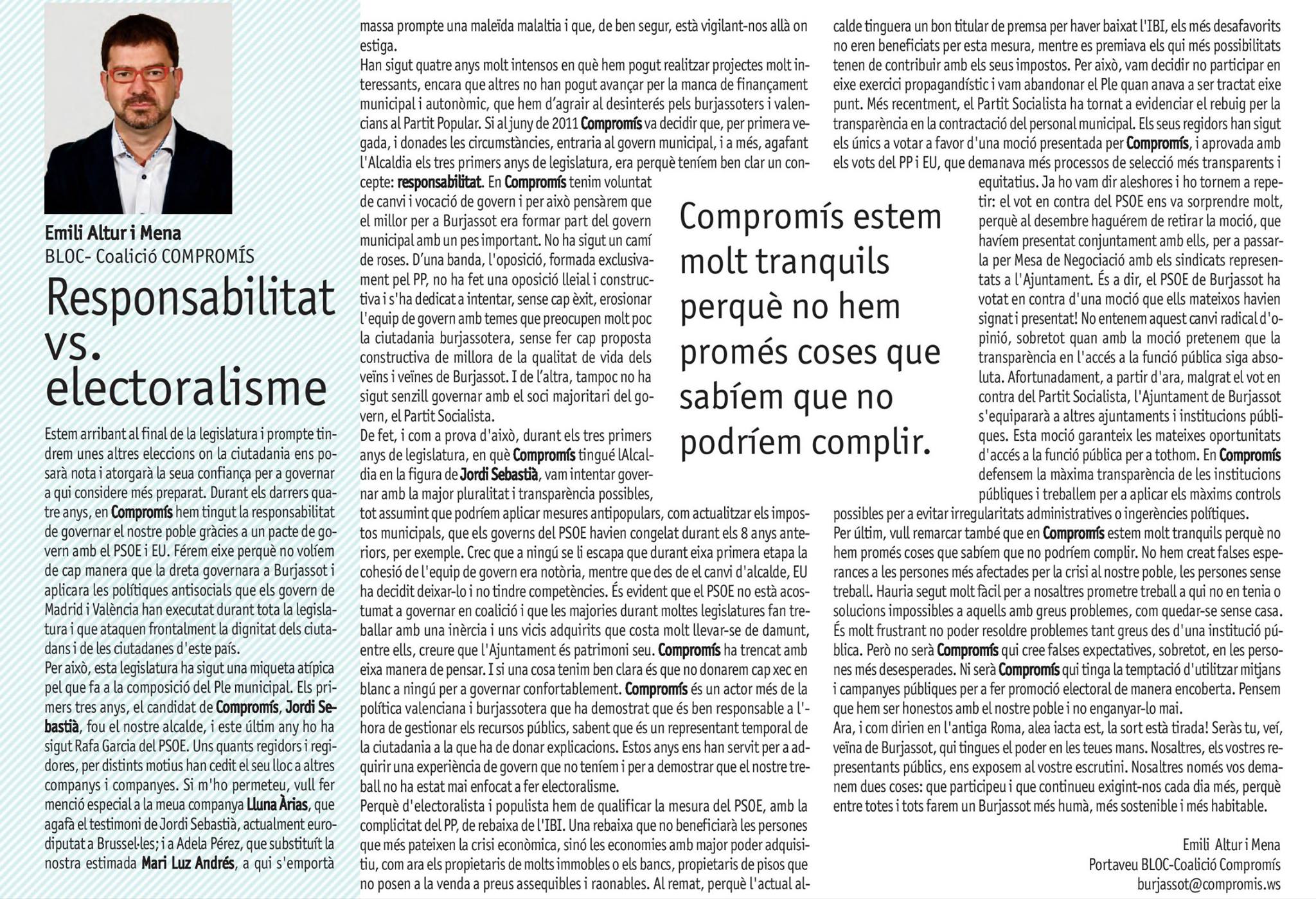 “Responsabilitat vs. electoralisme” és el títol de la columna d’opinió que com a portaveu municipal deCompromís Per Burjassot he publicat en el darrer número de “Burjassot Informació”, el butlletí d’informació municipal. Si encara no l’heu llegit, ací podeu fer-ho. I si us abellix, comentar-me la vostra opinió: